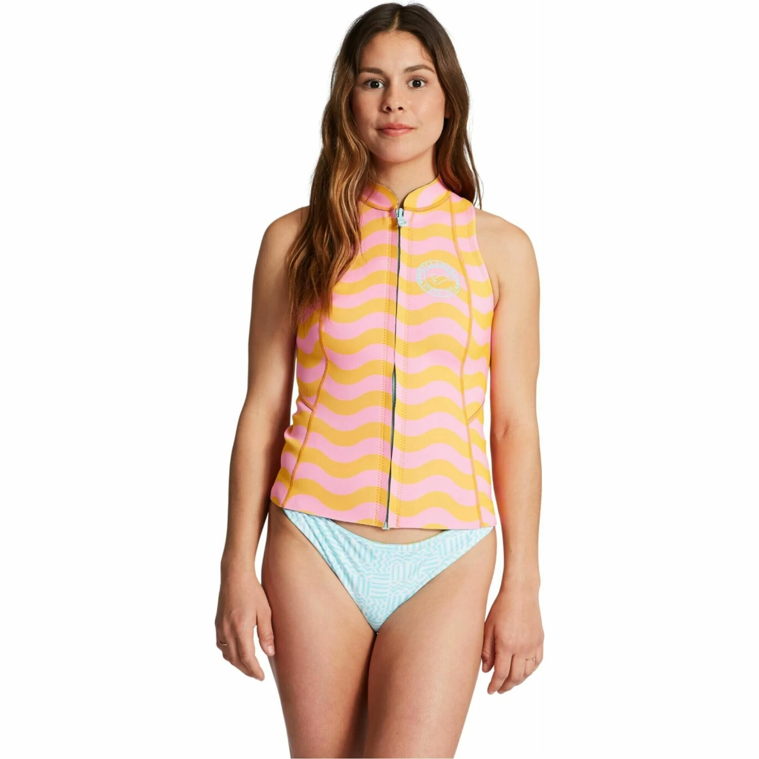Core heat and custom prints create a staple for Salty Dayz ahead. Part of the Billabong Surf Capsule Collection, the zip-front Salty Dayz wetsuit vest for women is perfect for tug and chill-free surf sessions. A high neck keeps the sun off your chest and offers up some added heat for cooler days. Constantly resurfaced with original prints, and now recycled, the 1mm women’s wetsuit vest is made from premium Recycled Superlight neoprene, a lightweight foam made partially from recycled car tires and neoprene scraps, topped with 100% recycled Superflex jersey, creating flexibility alongside sustainability. The Salty Dayz Vest for women is finished with non-toxic water based adhesive and flatlock stitch construction for comfort and durability.